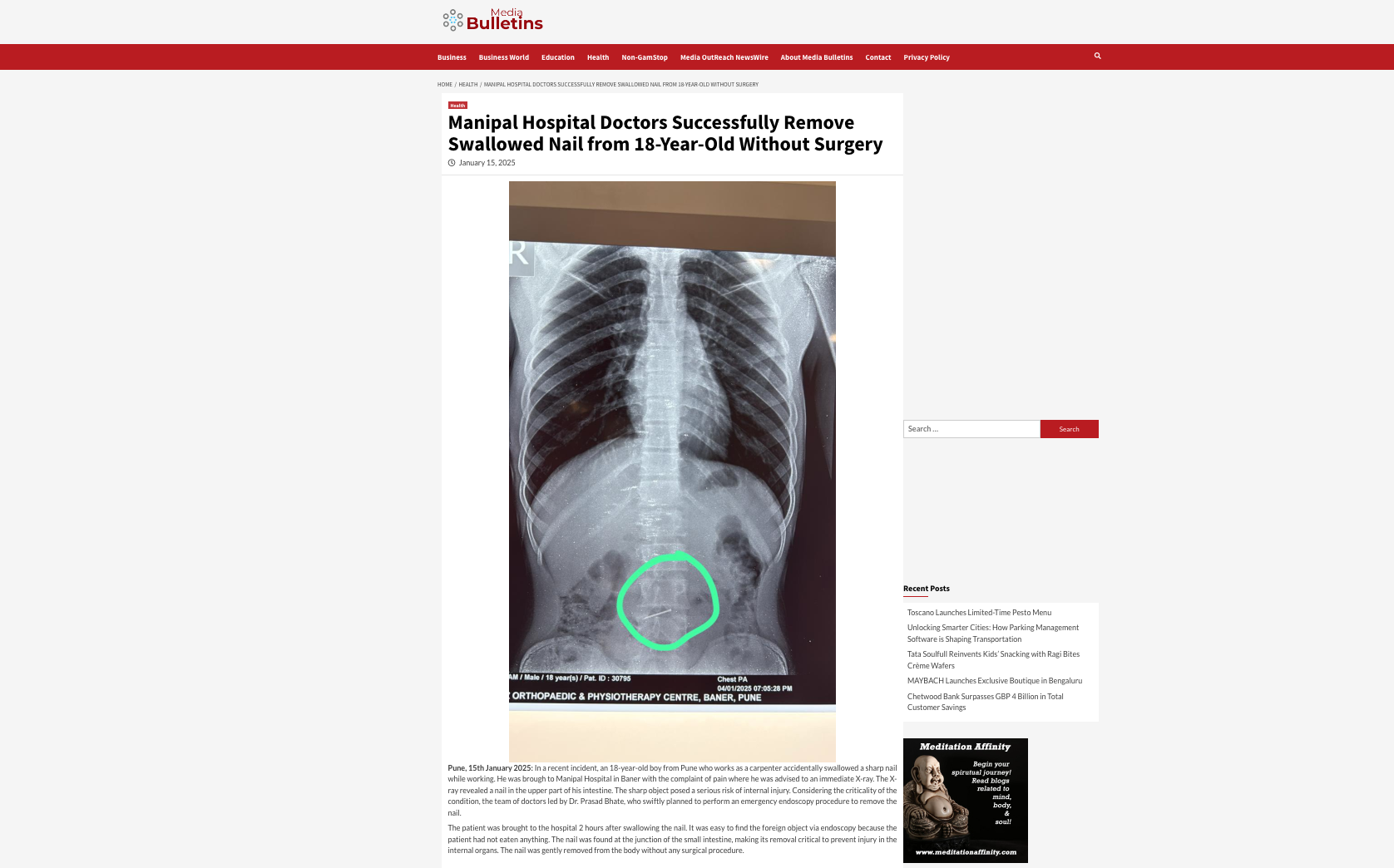 An 18-year-old carpenter from Pune narrowly avoided a potentially fatal incident when he accidentally swallowed a sharp nail while working. He was rushed to Manipal Hospital, Baner, with severe abdominal pain. Upon examination, an X-ray revealed the nail lodged in the upper part of his intestine, posing a serious risk of internal injury.