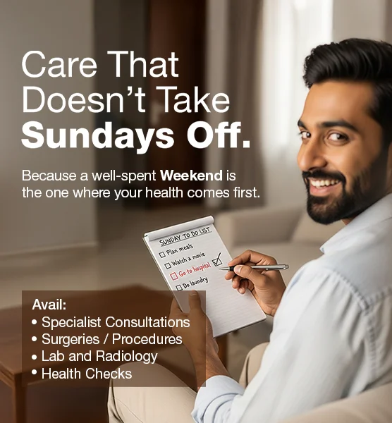 At Manipal Hospital Old Airport Road, we understand the pace and pressures of your busy weekdays. That is why our Sunday OPD services are thoughtfully designed to meet the convenient and flexible healthcare needs of working professionals, families, and senior citizens. With a commitment to providing seamless appointment scheduling and reduced wait times - we prioritize your comfort and our efficiency. Our multidisciplinary team of expert doctors is supported by comprehensive on-site diagnostics, advanced laboratory facilities, and a fully equipped pharmacy, ensuring holistic care under one roof.
