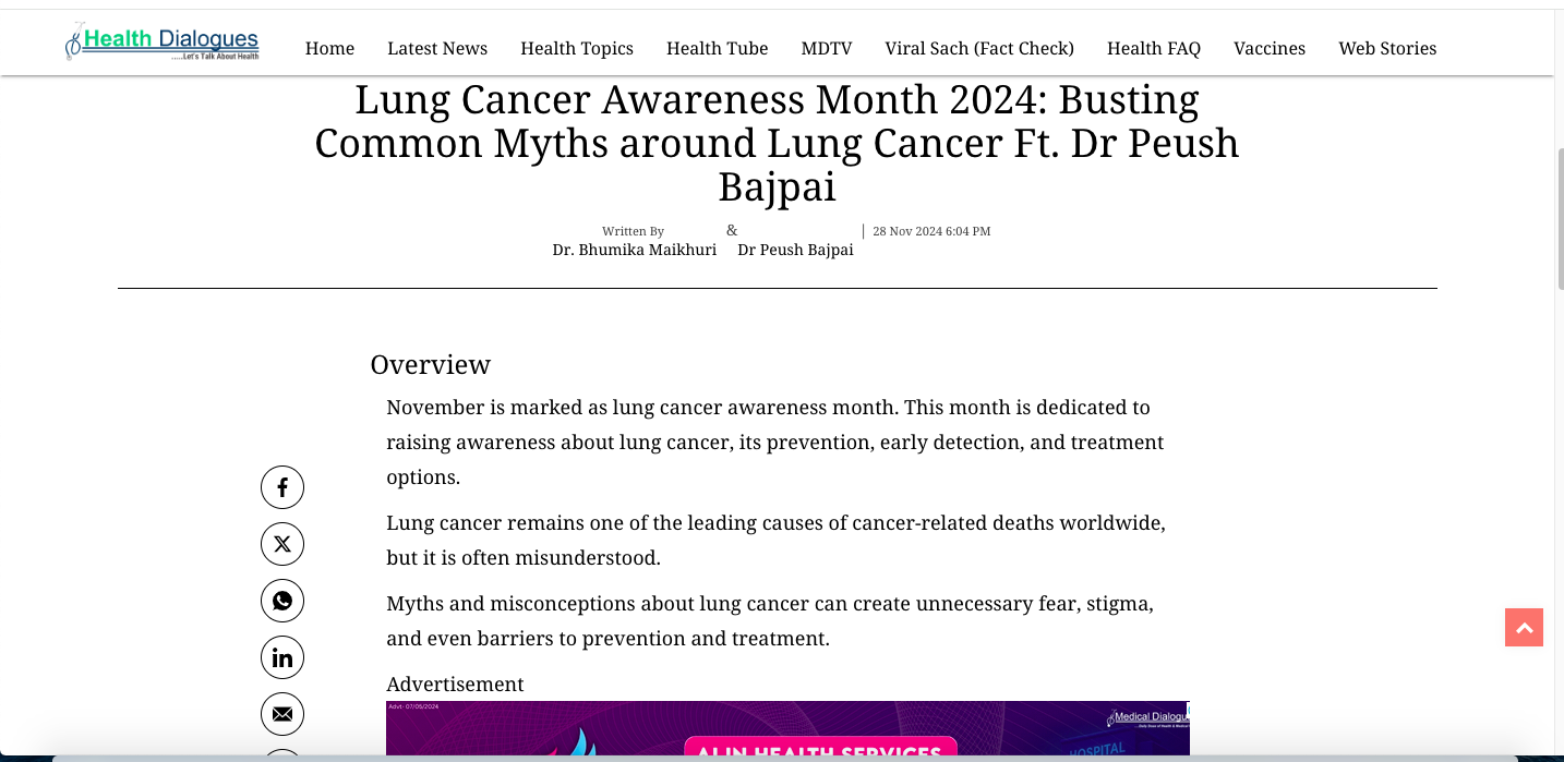 November is marked as lung cancer awareness month. This is dedicated to raising awareness about lung cancer, its prevention, early detection, and treatment options. Lung cancer remains one of the leading causes of cancer-related deaths worldwide, but it is often misunderstood. Myths and misconceptions about lung cancer can create unnecessary fear, stigma, and even barriers to prevention and treatment. The goal is to debunk common myths, provide accurate information, and empower you with knowledge to protect yourself and your loved ones.