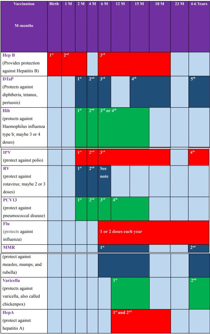 Given below is the typical schedule for vaccinations for babies up to age 6. Every doctor’s perception varies, as they may recommend different schedules for different babies. The table below shows the monthly doses of vaccinations. Parents should communicate with the doctor to understand the different dosages of vaccines their child receives if the timetable calls for more than one month between doses.