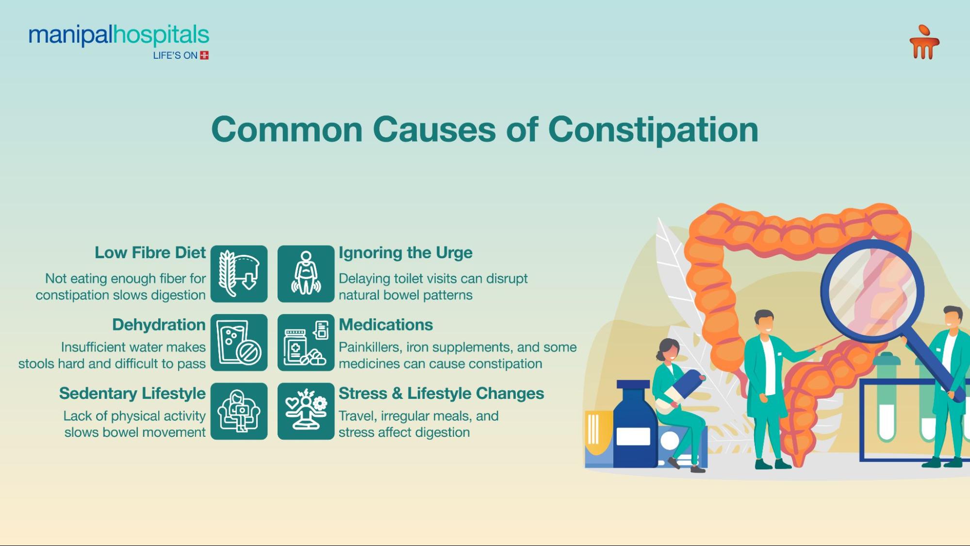 Low fibre diet, dehydration, medications, thyroid disorders, and digestive conditions like IBS are common causes.