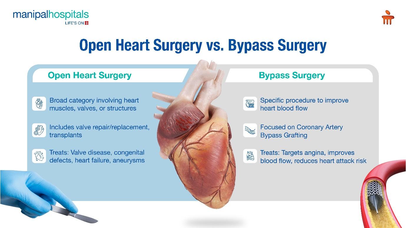 Here is a comparison of the key differences between open heart surgery and bypass surgery: