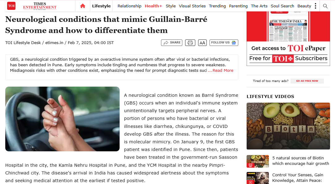 A neurological condition known as Barré Syndrome (GBS) occurs when an individual's immune system unintentionally targets peripheral nerves. A portion of persons who have bacterial or viral illnesses like diarrhoea, chikungunya, or COVID-19 develop GBS after the illness. The reason for this is molecular mimicry. On January 9, the first GBS patient was identified in Pune. Since then, patients have been treated in the government-run Sassoon Hospital in the city, the Kamla Nehru Hospital in Pune, and the YCM Hospital in the nearby Pimpri-Chinchwad city. The disease's arrival in India has caused widespread alertness about the symptoms and seeking medical attention at the earliest if tested positive.