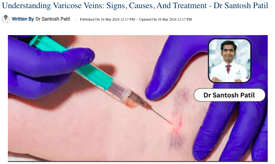 In his article, Dr. Santosh Patil explores varicose veins, covering signs, symptoms, causes, and treatments. Varicose veins, often seen in the legs, result from weakened vein walls and valves, leading to pain, swelling, and visible veins. Dr. Patil discusses treatment options, from lifestyle changes to surgery, highlighting the importance of early intervention for effective management.