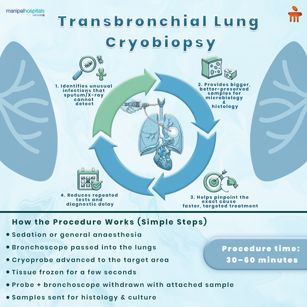 Transbronchial lung cryobiopsy is a powerful tool in diagnosing pneumonia when routine tests are not enough. For you as a patient, it can shorten the path to a precise diagnosis, reduce repeated procedures, and allow treatment that is tailored to the specific cause. The technique carries some risk, but when performed by an experienced interventional pulmonology team, the balance of benefit to risk is often favourable in complex lung infections. If you are facing persistent or unusual pneumonia, discuss cryobiopsy as one of the options with a specialist such as Dr. Jagadeesh Kumar P at Manipal Hospitals Malleshwaram.