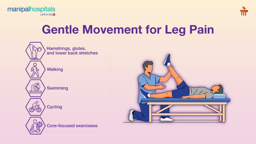 Gentle exercises that promote flexibility, strengthen core muscles, and improve circulation are beneficial. These include walking, swimming, cycling, yoga, and specific stretches for the hamstrings, glutes, and lower back, guided by a physiotherapist.