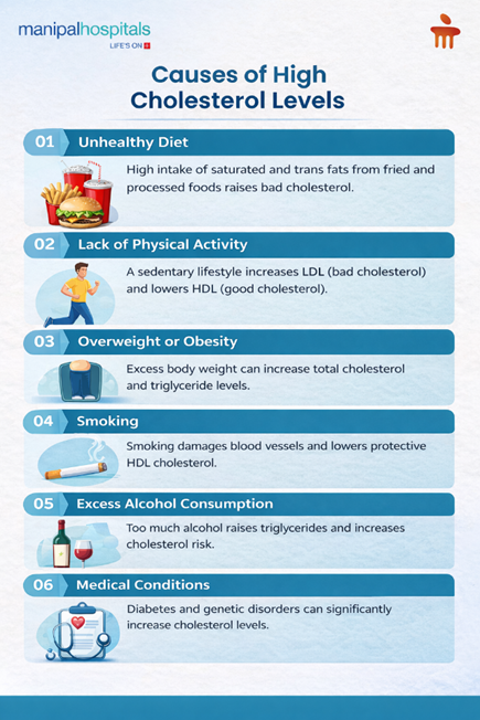 Cholesterol is important for your body, but keeping it in the normal range is key to heart health. Regular screenings are the best way to catch problems early, since there are no clear cholesterol symptoms. Making small changes to your daily life, such as eating healthy, exercising regularly, maintaining a healthy weight, and not smoking, can have a significant impact on your cholesterol levels. At Manipal Hospitals Millers Road, experienced cardiologists provide advanced cholesterol treatment in Millers Road, Bangalore; thorough screenings; personalised treatment plans; and preventive care to help patients manage cholesterol and protect their heart health.