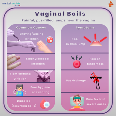 A vaginal boil is a localised skin infection that begins in a hair follicle or oil gland and forms a tender, pus-filled lump. These lumps can appear on the vulva, labia, or near the perineum. A boil is also called a furuncle if it involves a single hair follicle, and multiple linked boils are known as carbuncles. Boils are usually caused by bacteria that enter the skin through minor breaks. You can feel a boil as a firm, painful nodule that becomes softer as pus accumulates.