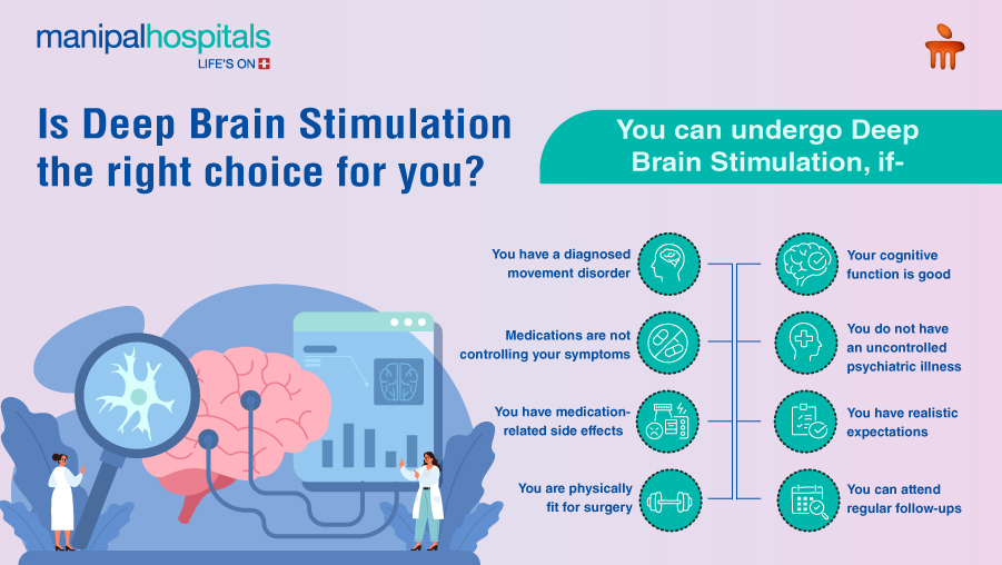 Identifying the right candidate for Deep Brain Stimulation (DBS) requires careful assessment of symptoms, medication response, and overall health status. Patients with persistent movement-related challenges despite optimal treatment often benefit the most. At Manipal Hospitals, we offer advanced DBS options with transparent pricing and expert guidance. While the cost may vary, many patients experience significant improvements in quality of life and reduced medication dependence, making DBS a valuable, life-changing investment. If you or your loved one is experiencing symptoms of a movement disorder or another neurological condition, book a consultation with our neurosurgery experts at Manipal Hospitals Mukundapur today to explore if DBS is the right option for you.