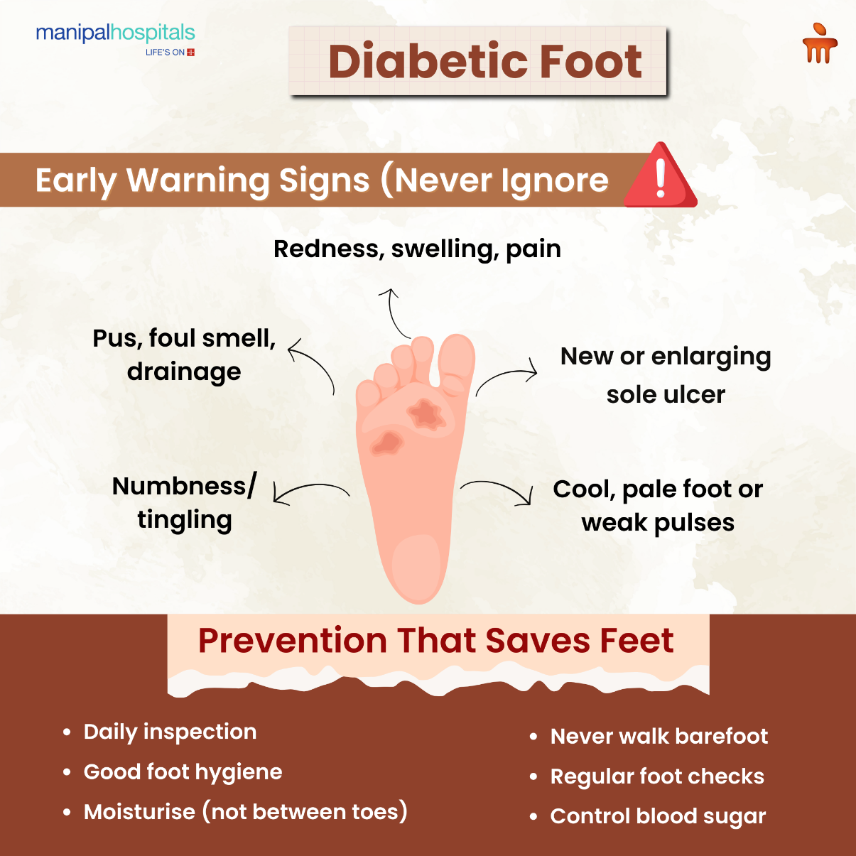 Diabetes affects the feet through a combination of nerve damage, poor circulation, and impaired healing. Early detection, simple daily foot hygiene, pressure relief with offloading, targeted infection control, and timely revascularisation when needed dramatically reduce amputation risk. Most importantly, coordinated care from a multidisciplinary team and clear patient education at Manipal Hospitals convert threats into manageable risks. With attention and the right interventions, most people with diabetes can keep their feet healthy and mobile.