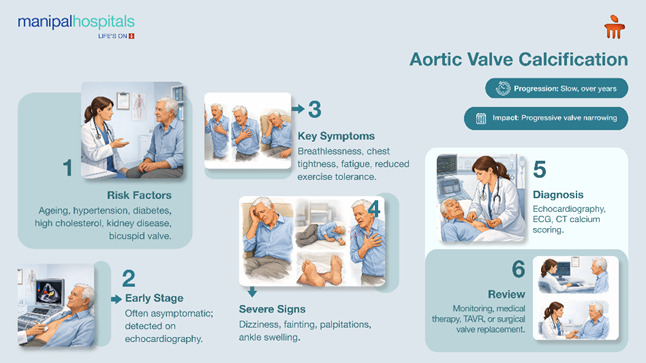 Aortic valve calcification is a heart valve disease that can be managed with advanced care. This condition is most often seen in older adults and people with heart risk factors, but early detection makes a big difference. With better diagnostic tools, less invasive procedures, and improved surgeries, today’s treatments can lead to great results and a better quality of life. At the Cardiology, Manipal Hospitals Sarjapur Road, Bangalore our heart specialists offer detailed check-ups, advanced imaging, and personalised care plans tailored to each person with valve disorders.