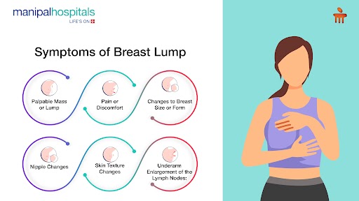 A breast lump may present itself as a noticeable swelling, thickening, or mass in the breast tissue. It can be hard, soft, painful, or sometimes painless. Other symptoms include changes in breast size, shape, skin texture, and nipple discharge. Not all lumps are cancerous but they require thorough medical evaluation. When assessing a breast lump, take into account the following important breast cancer tumour symptoms:
