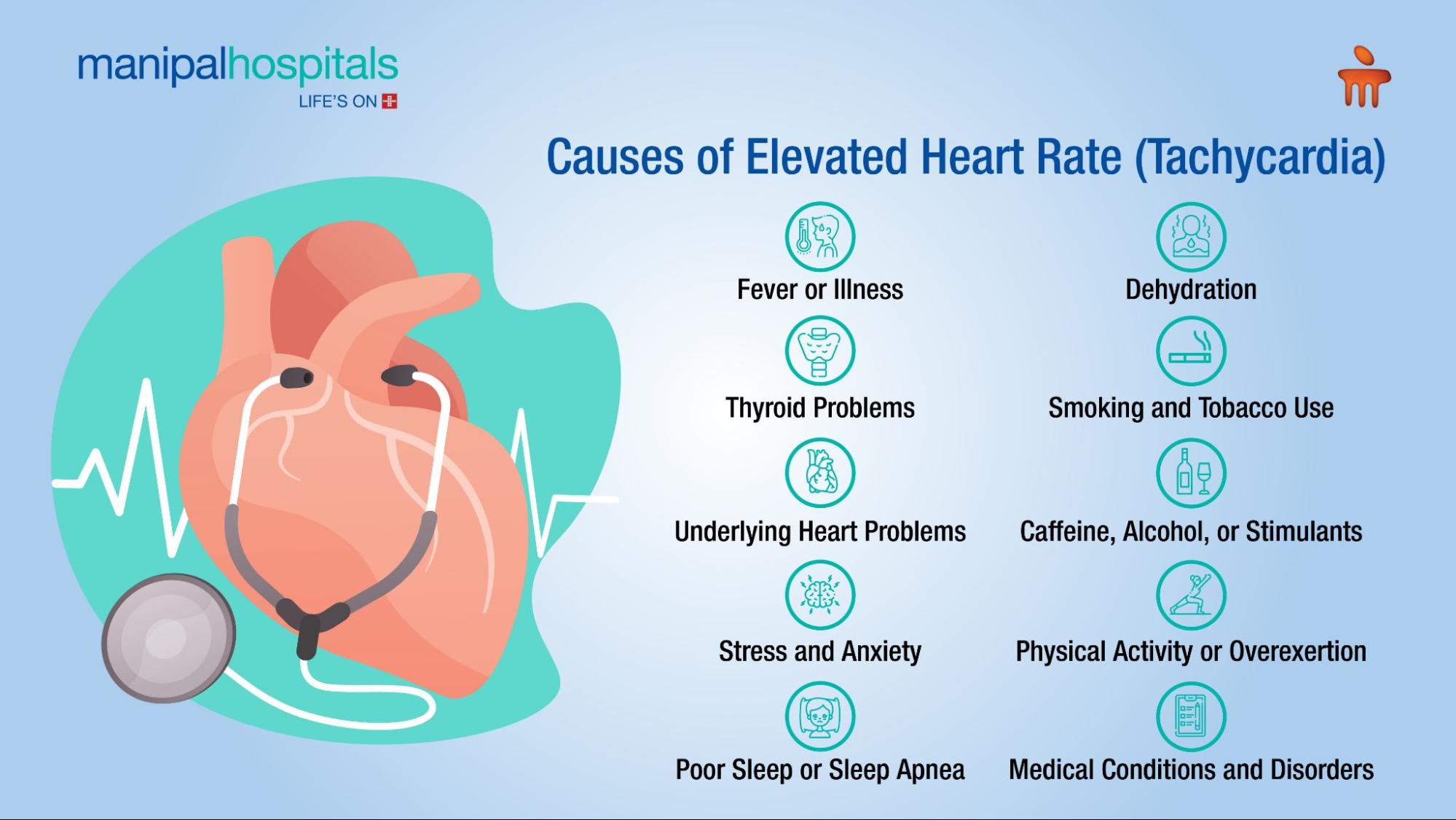 Health issues like anaemia (low red blood cells), low blood pressure, or infections can lead to tachycardia. Additionally, conditions affecting the electrical signals in the heart may directly cause a rapid heart rate.